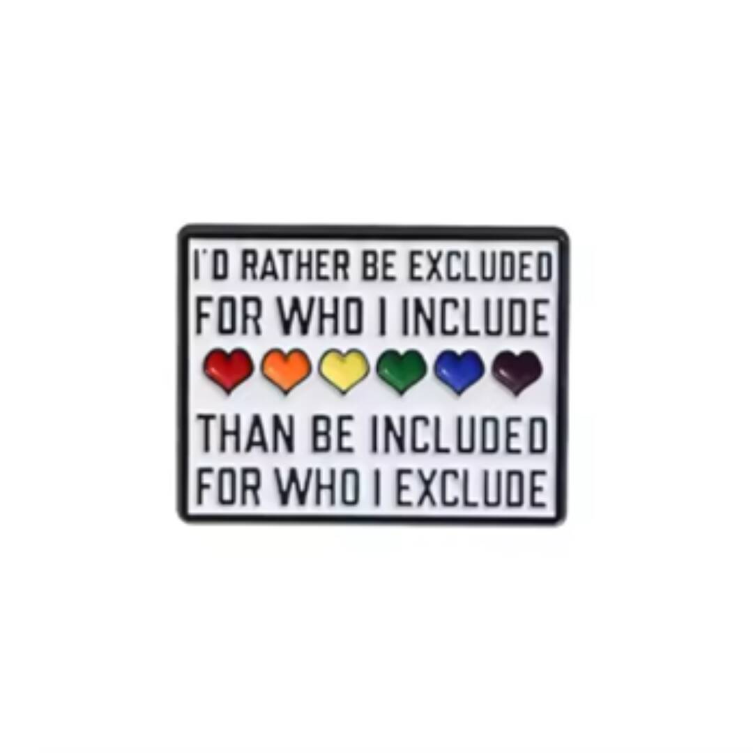 Dette er en pride pin med et kraftig budskap som handler om ekte inkludering. Det handler om mot, men også rettferdighet. Oversatt til norsk, så er teksten “Jeg vil heller bli ekskludert for hvem jeg inkluderer enn å bli inkludert for hvem jeg ekskluderer”. Det er et kraftfullt budskap om rettferdighet, og det å inkludere andre. I midten av denne pride pin finner du 6 hjerter som har hver sin farge fra prideflagget. 🌈❤️